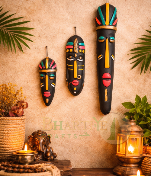 Terracotta Wall Hanging Multicolored Tribal Mask Combo (3 Pcs) | Handcrafted Jharkhand Tribal Art | Bhartiye Crafts