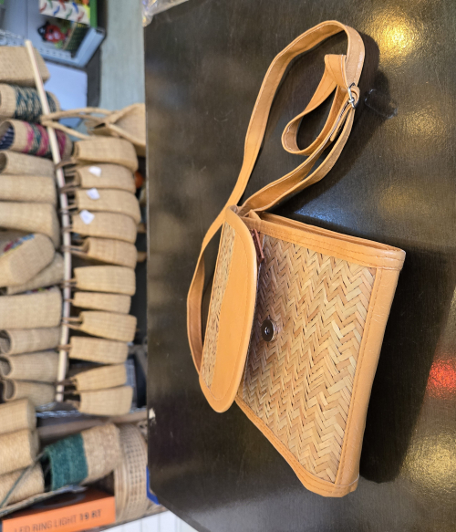 A stylish Shitalpati tab sling bag with a secure lock. Lightweight, durable, and perfect for daily use while showcasing traditional Indian weaving.