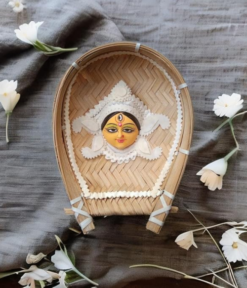 - ✔ Mounted on Traditional Bamboo Winnow (Kula) – The Sholapith Durga face is beautifully fixed on a handcrafted bamboo winnow, adding an authentic ethnic look.