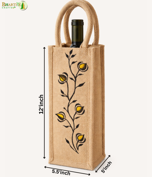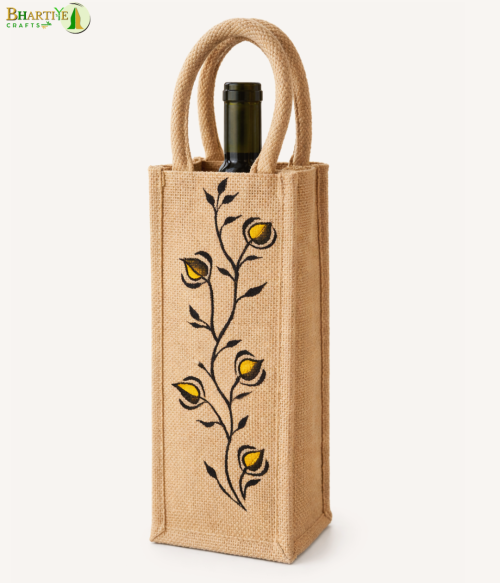 Premium Handcrafted Design – Beautifully handcrafted jute bottle bag featuring elegant floral embroidery, adding a unique artistic touch to your bottle gifting.